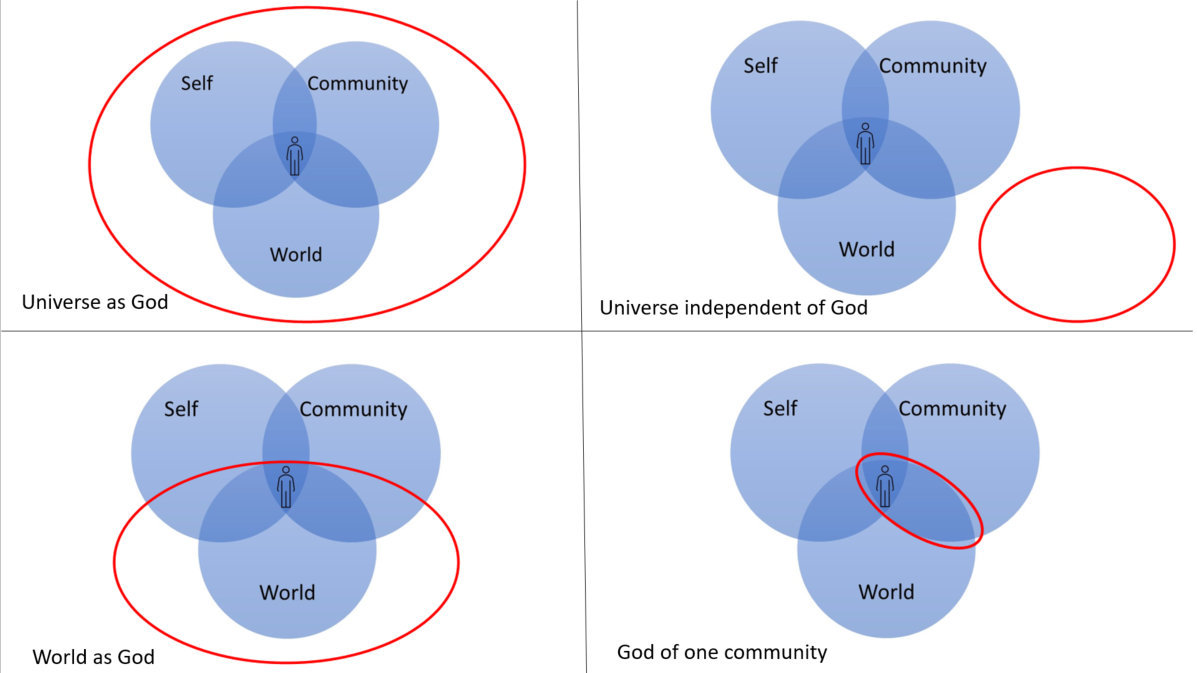 Is this a Christian God? Possibly there is a flavor of this somewhere, but it doesn't seem to be to me. I think you could also capture a lot of nature polytheism into this kind of description of god where each god is a component of the world maybe? I don't know. Venn diagrams don't capture all the complexity of world religions I guess.